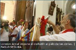 En un acto breve y sencillo, celebrado instantes antes en el postergado de templo Laurentino, bajo la atenta mirada de San Lorenzo en su peana, y la asistencia de autoridades, cofrades, danzantes y antiguos danzantes, el Prior de la Real Cofradía, Lorenzo Arnal, colocó sobre el palo de las cintas un corbatín rojo que simboliza el nombramiento. Durante el acto, se resaltó el camino paralelo de las dos instituciones, que durante siglos se han encargado de mantener viva la llama del amor de Huesca hacia su Patrono.