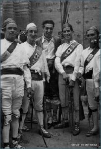 Danzantes "señoritos" En esta foto se puede contemplar a Pepito Martínez (portador del palo de las cintas), junto a Jose Laborda "Joseton" (rapatán) y varios danzantes infantiles. La incorporación de tres danzantes (Pepito Martínez, Emilio Miravé, y Marianito Pérez) que rompían con la tradición de que el danzante era labrador, fue el origen de la denominación danzantes "señoritos". |