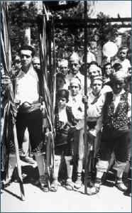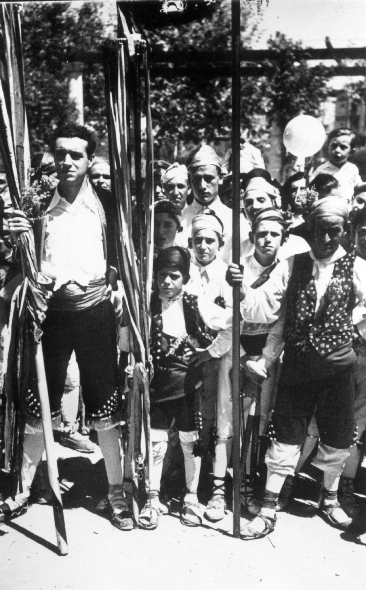Danzantes "señoritos" En el centro, de izda a derecha, Mariano Pérez, Pepito Martínez (palo de cintas) y Emilio Miravé Díez. |