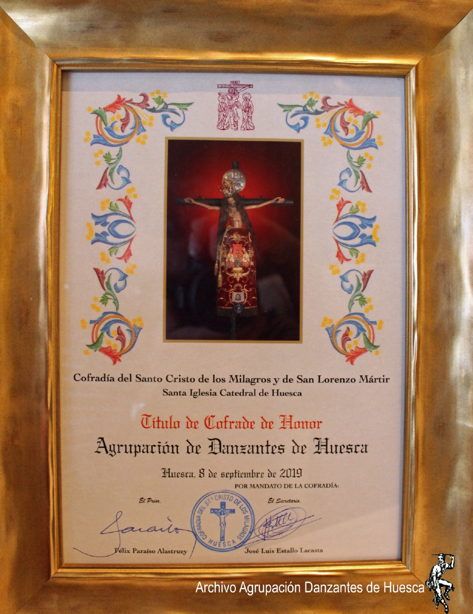 La cofradía del Santo Cristo de los Milagros y San Lorenzo Mártir otorga el título de Cofrade de honor, a la Agrupación de Danzantes de Huesca. Entrega dicho título, el Prior Félix Paraíso Alastruey y lo recoge nuestro Mayoral Francisco San Emeterio. |