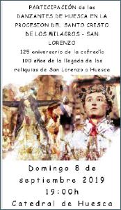 Los Danzantes de Huesca participarán el próximo domingo 8 de septiembre en la procesión del 125 aniversario de la Cofradía del Santo Cristo de los Milagros y San Lorenzo Mártir de Huesca. Será una actuación excepcional con motivo de un acontecimiento único en la ciudad.