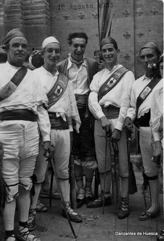 "Con el año 1933 vino el alumbramiento de los denominados "señoritos". Por aquella época, al parecer, todos los obreros tenían que pertenecer a la CNT. A algunos les amenazaron si seguían danzando, y varios se retiraron. Esta es una historia que a ningún danzante le gusta recordar. La proyección de los danzantes de Huesca se veía en peligro y es aquí cuando entran Pascual Tricas, "confitero" de toda la vida; Hilario Nogués, "alpargatero"; Miguel Viñuales "Michino", y Pascuala Ramón, madre de Victorino Solanes, y deciden idear una solución: La Agrupación de Danzantes infantiles, que, entremezclada con un cuadro de "danzantes mayores", sacarían adelante la tradición. Flora Solanes, sería quien les confeccionaría los vistosos trajes de danzante"