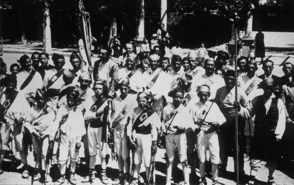 Danzantes infantiles, veteranos y "señoritos" A pesar de la tensión social y laboral, los danzantes salieron en el año 1933. Se hicieron multitud de fotos a estos niños que danzaron, al igual que los veteranos, y sintieron en sus pechos la misma pasión. En esta foto se puede observar a los danzantes infantiles, veteranos o labradores y "señoritos" en el parque de Huesca. |