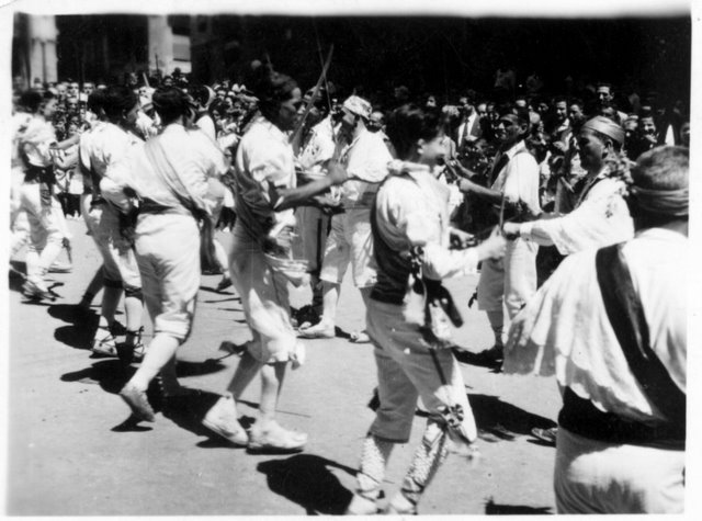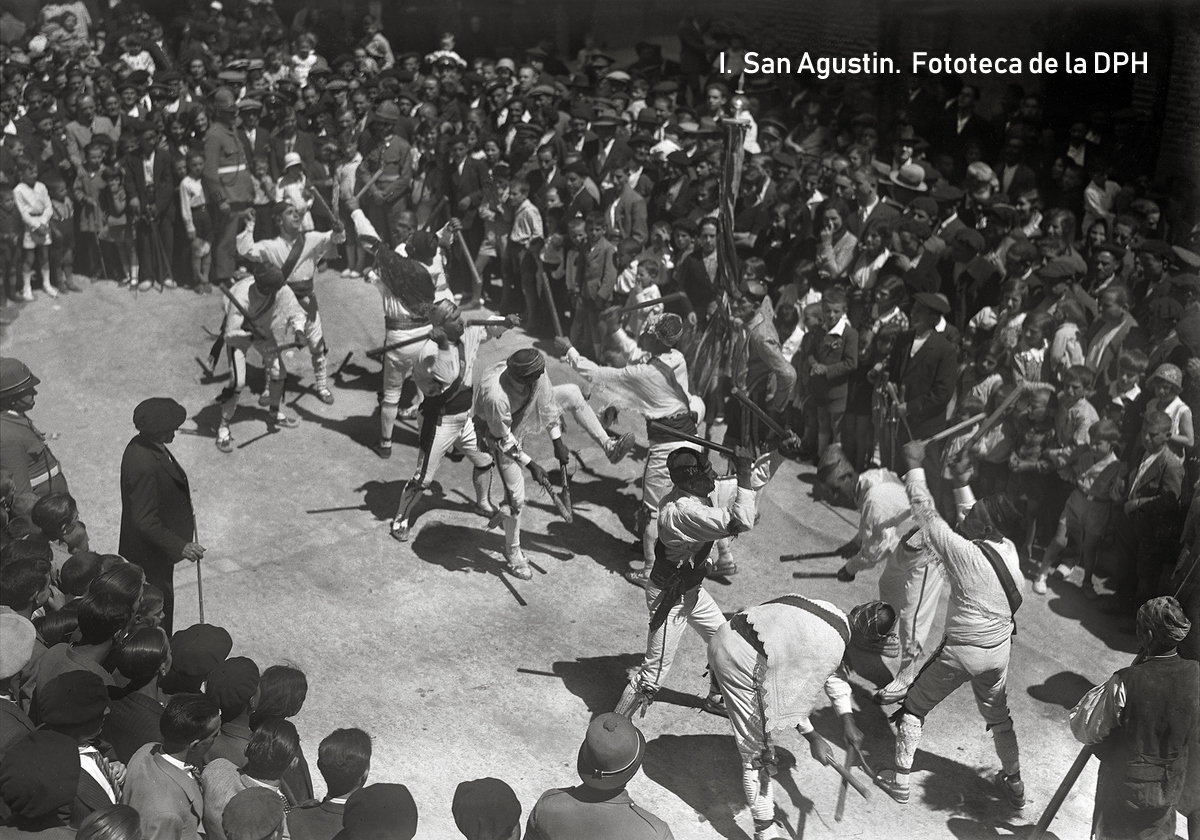 Danzantes en 1922 Entre los años 1917 y 1923 el número de danzantes disminuyó y solamente danzaban tres cuadros, por lo que no se realizaba el dance de las cintas (I. San Agustin. Fototeca de la DPH) |