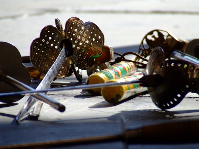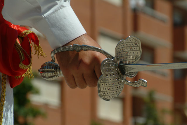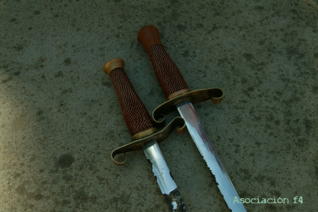 La espada, juntamente con la daga, son otros instrumentos muy importantes para el dance. Esto nos hace pensar en una época muy primitiva, no olvidemos que nuestro dance principal (danza de espadas y "Degollau") son guerreros. Muchas de estas espadas pertenecieron a personal del ejercito, siendo alguna de ellas verdaderamente antigua (Victorino Solanes, anterior mayoral, llegó a danzar con una espada que fue utilizada en la guerra de Cuba). Otras espadas, y la mayoría de las dagas, están hechas a mano por herreros