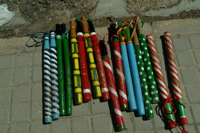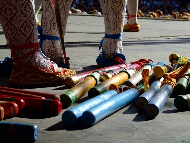 Dos palos de madera muy resistente, casi siempre de bojo o de carrasca, preferiblemente de pie, permiten soportar los golpes que los danzantes se intercambian entre sí. Cada "palo va provisto de un cordel o cinta para sujetarse a la muñeca. Antiguamente, estos palos eran redondeados por artesanos o por los propios danzantes. Hasta hace muy pocos años era Gregorio Gracia quien los tornaba, en ese viejo torno de madera, hoy preciada pieza de museo. ¿Cuantos "palos" de danzar habrán pasado por sus manos?