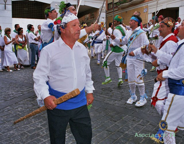 Como complementos, un bastón de "mando" que porta en la mano derecha y un ramo de olorosa albahaca en la otra mano. En el baston que luce el actual mayoral, Pascual Campo, se pueden observar tallados los 27 danzantes de la Agrupación.